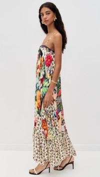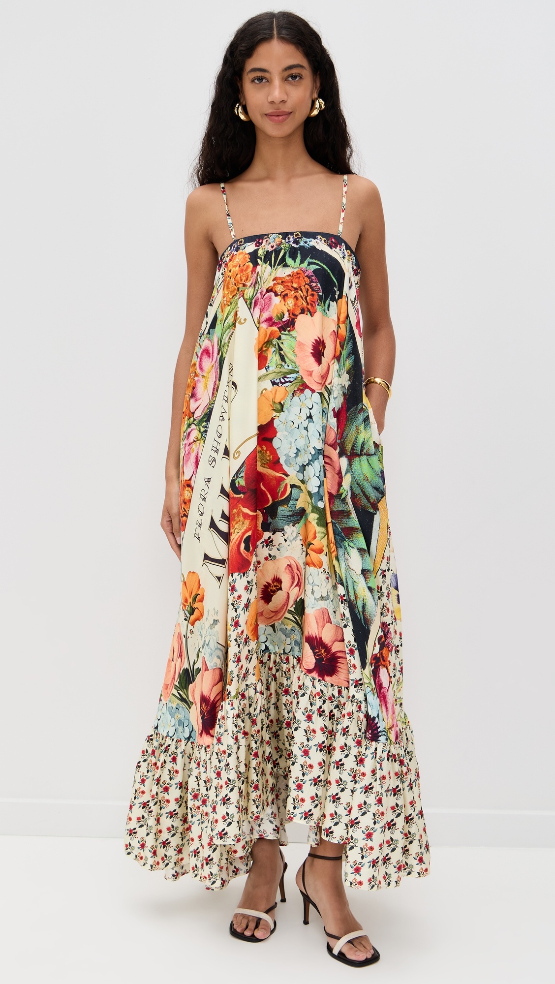 - Fabric: Lightweight, non-stretch silk twill - Ruffle hem - Rhinestone embellishments at bust - Maxi length - Square neckline - Adjustable shoulder straps - Hidden zip at back - Shell: 100% silk - Lined - Dry clean - Imported, India Style #CAMLA31011
