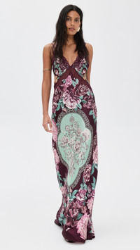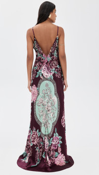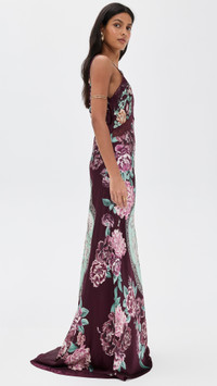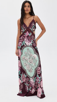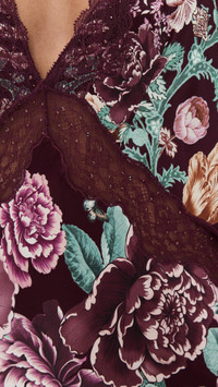 - Fabric: Lightweight, non-stretch weave - Floral pattern - Lace trim with crystal embellishments at top - Maxi length - V neck - Adjustable shoulder straps - No closure, pull-on design - Shell: 100% silk - Unlined - Dry clean - Imported, China Style #CAMLA31018