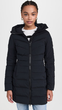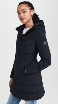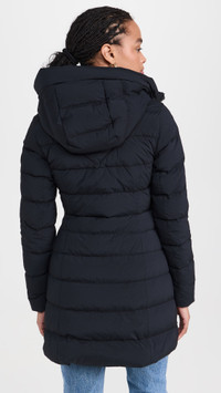 - Fabric: Lightweight, stretch quilted technical weave - Long sleeves with elastic cuffs and thumbholes - Packs into interior pocket for easy storage - Patch logo at sleeve and reflective stripe at hood - Mid-length profile with interior drawstring at waist - Interior backpack straps - Hooded neckline - Zip closure and snap placket - Slant side pockets with snap closure - Shell: 87% polyamide/13% elastane - Lined - Fill: 90% down/10% feathers - Wash cold - Made in Canada - Warmth rating: - 32° to 5°F / 0° to -15°C Style #CANAD30789 Size & Fit Model measurements: Size XS: Alexis (5'8") usually wears size XS-S Measurements from size S Length: 32.25in / 82.0cm, from shoulder