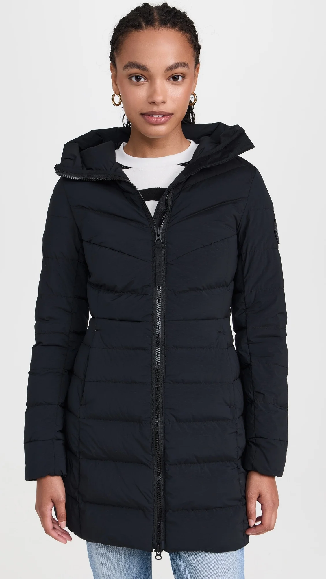 - Fabric: Lightweight, stretch quilted technical weave - Long sleeves with elastic cuffs and thumbholes - Packs into interior pocket for easy storage - Patch logo at sleeve and reflective stripe at hood - Mid-length profile with interior drawstring at waist - Interior backpack straps - Hooded neckline - Zip closure and snap placket - Slant side pockets with snap closure - Shell: 87% polyamide/13% elastane - Lined - Fill: 90% down/10% feathers - Wash cold - Made in Canada - Warmth rating: - 32° to 5°F / 0° to -15°C Style #CANAD30789 Size & Fit Measurements from size S Length: 32.25in / 82.0cm, from shoulder