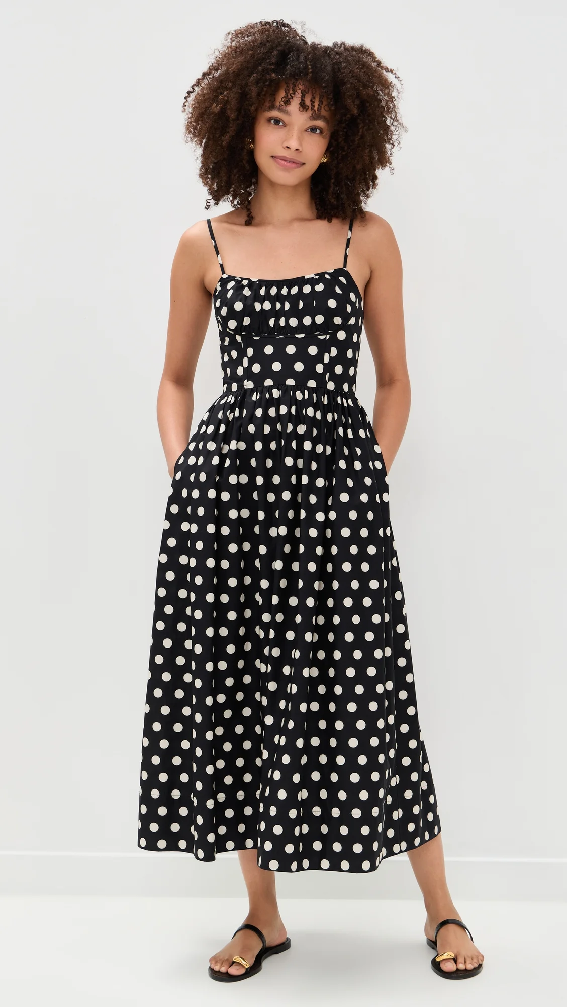 - Fabric: Lightweight, non-stretch crisp weave - Polka dot print - Midi length - Square neckline - Adjustable shoulder straps - Zip closure and smocked elastic at back - On-seam side pockets - Shell: 100% cotton - Lined - Dry clean - Imported, China Style #CCARA30345