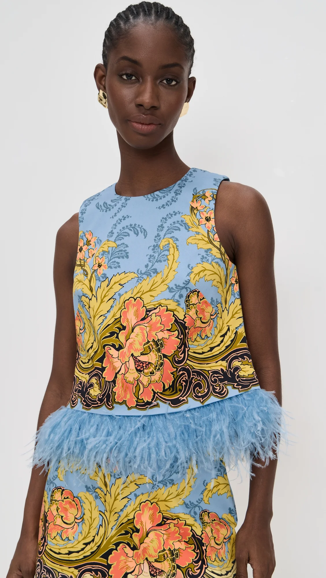 - Fabric: Lightweight, low-stretch sateen - Floral print - Ostrich feather hem - Crew neck - Sleeveless - Hook-and-eye and hidden zip at back - Shell: 97% cotton/3% spandex - Lined - Lining: 100% polyester - Dry clean - Imported, China Style #CCARA30344 Size & Fit Model measurements: Size XS: Cher (5'11") usually wears size XS Measurements from size XS Length: 18.5in / 47.0cm, from shoulder