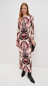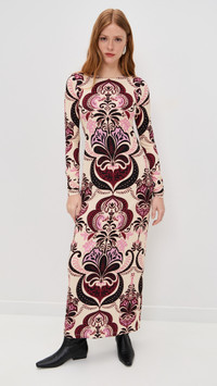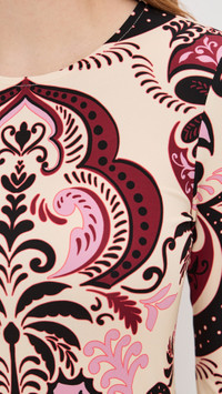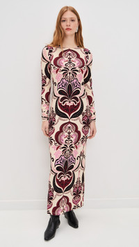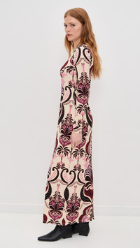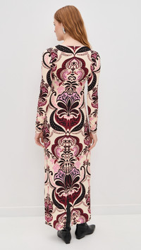 - Fabric: Lightweight, super-stretch slinky jersey - Ruching at sleeves - Paisley print - Maxi length - Crew neck - Long sleeves - Hook-and-eye and hidden zip at back - Shell: 93% viscose/7% spandex - Unlined - Dry clean - Imported, China Style #CCARA30352