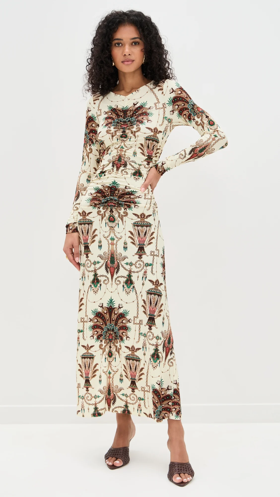 - Fabric: Mid-weight, super-stretch slinky jersey - Abstract pattern - Ruched bodice - Maxi length - Crew neck - Long sleeves - Hook-and-eye and hidden zip at back - Shell: 93% viscose/7% spandex - Unlined - Dry clean - Imported, China Style #CCARA30335