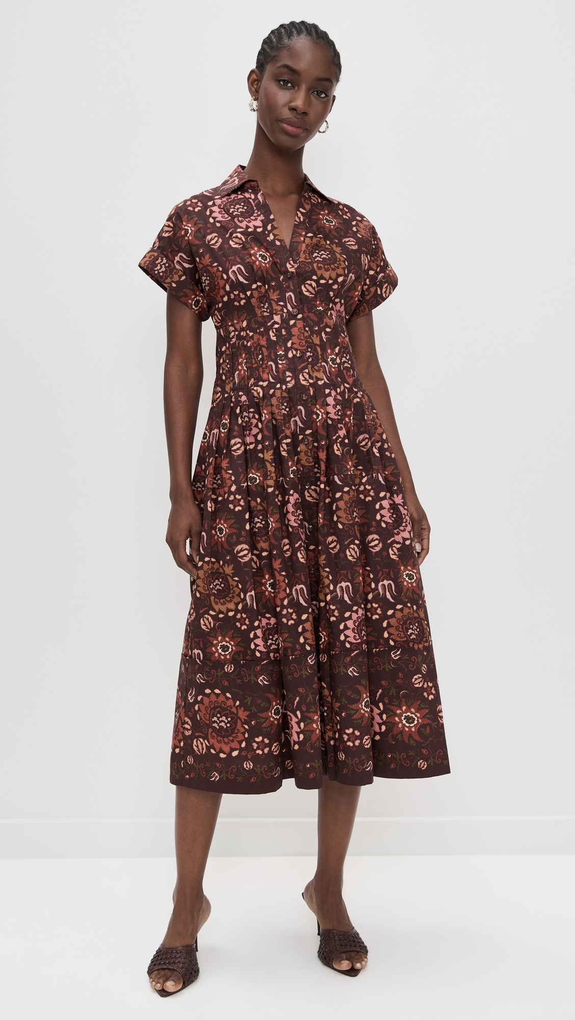 - Fabric: Lightweight, non-stretch poplin - Floral and paisley print - Pintuck pleated waist and bust - Folded cuffs - Midi length - Collared neck - Short sleeves - Button placket - On-seam side pockets - Shell: 100% cotton - Unlined - Dry clean - Imported, China Style #CCARA30320 Size & Fit Customers say: Runs small; please size up. Model measurements: Size XS: Cher (5'11") usually wears size XS Measurements from size XS Length: 47.75in / 121.0cm, from shoulder to front hem