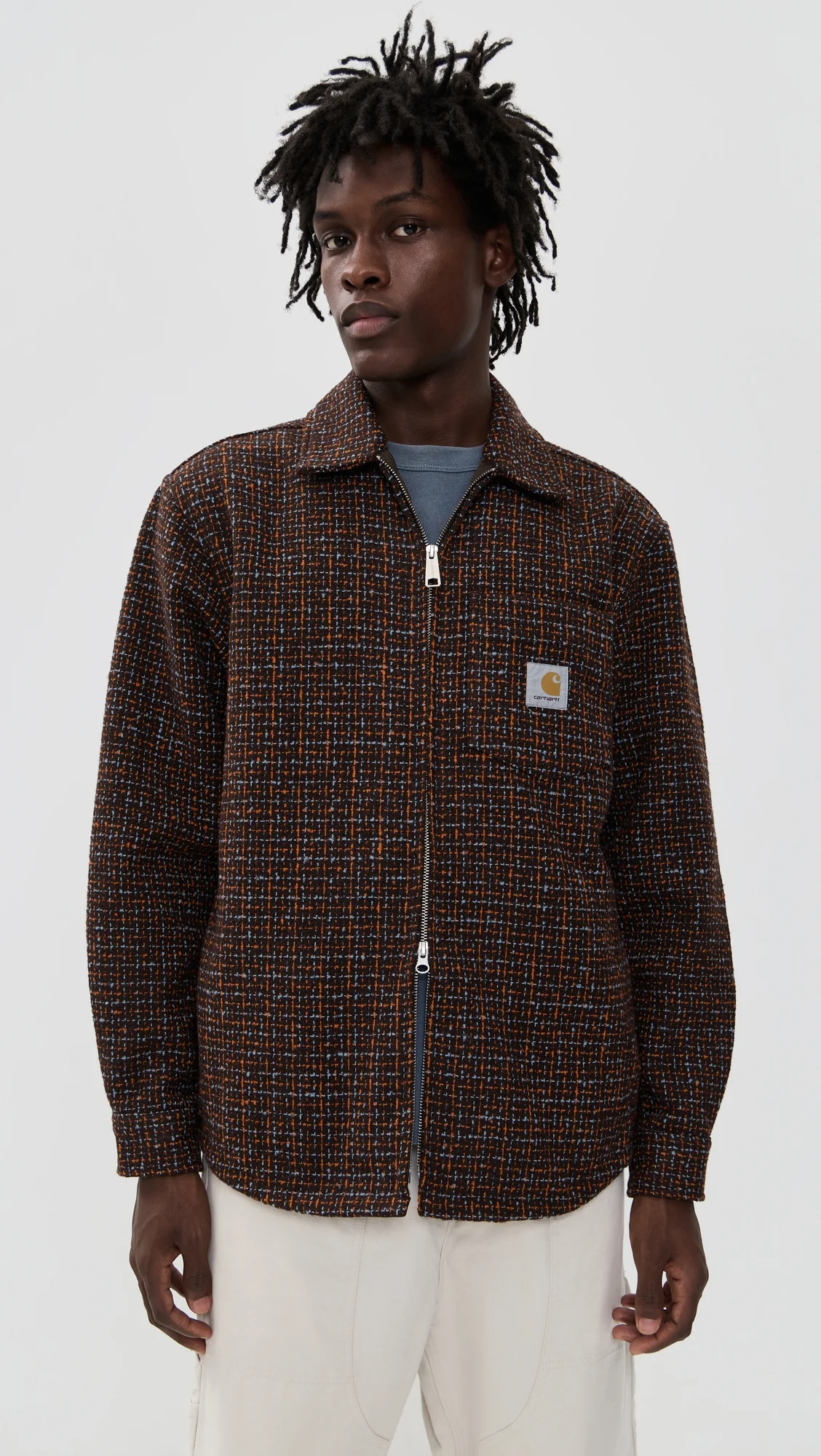- Fabric: Heavyweight, non-stretch boucle weave - Logo patch at front - Check pattern - Collared neckline - Long sleeves with button cuffs - Zip at front - Patch breast pocket - Patch front pockets - Shell: 100% polyester - Unlined - Wash cold - Imported, Bangladesh Style #CARHA30955