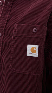 - Fabric: Heavyweight, non-stretch corduroy - Logo patch at front - Curved hem - Collared neckline - Long sleeves with button cuffs - Button placket - Patch breast pocket - Shell: 100% cotton - Unlined - Wash cold - Imported, Cambodia Style #CARHA30965 Size & Fit Model measurements: Size M: Idriss (6'1") usually wears size M-L Measurements from size M Length: 30.75in / 78cm Sleeve: 35.5in / 90cm Chest: 47.25in / 120cm