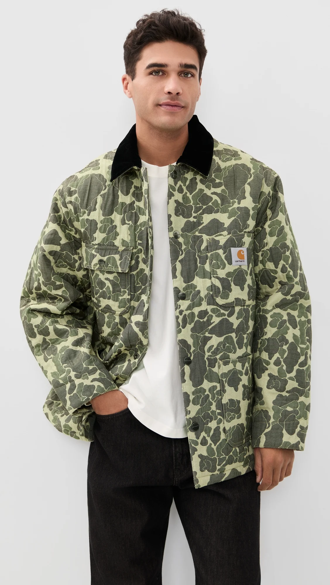 - Fabric: Mid-weight, non-stretch canvas - Velvet top collar - Allover camo design - Logo patch at front - Collared neckline - Long sleeves - Snap placket - Multiple exterior pockets - Shell: 78% cotton/21% polyester/1% nylon - Trim: 100% polyester - Lined - Lining: 100% nylon - Fill: 100% polyester - Wash cold - Imported, Cambodia Style #CARHA30953 Size & Fit Model measurements: Size M: Laurence (6'2") usually wears size M Measurements from size M Length: 30.25in / 77cm Sleeve: 34.25in / 87cm Chest: 45.75in / 116cm