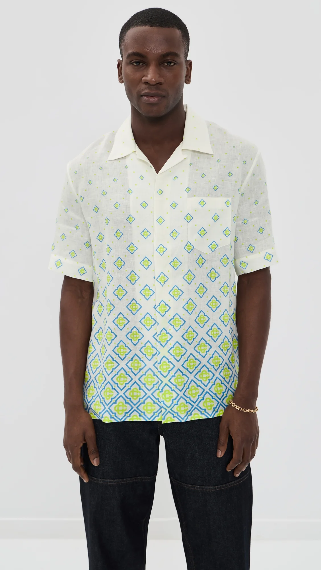 - Fabric: Lightweight, non-stretch linen weave - Logo monogram pattern - Collared neckline - Short sleeves - Covered button placket - Patch breast pocket - Shell: 100% linen - Wash cold - Made in Italy Style #CASAC30008