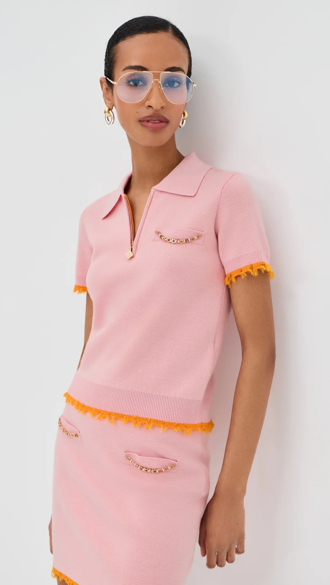 - Fabric: Mid-weight stretch knit - Contrast frayed edges - Gold-tone hardware - Polo neckline - Short sleeves - Zip at front - Shell: 96% wool/3% polyamide/1% elastane - Unlined - Hand wash or dry clean - Imported, China Style #CASAB30328 Size & Fit Model measurements: Size XS: Mical (5'10") usually wears size XS Measurements from size XS Length: 19.25in / 49.0cm, from shoulder