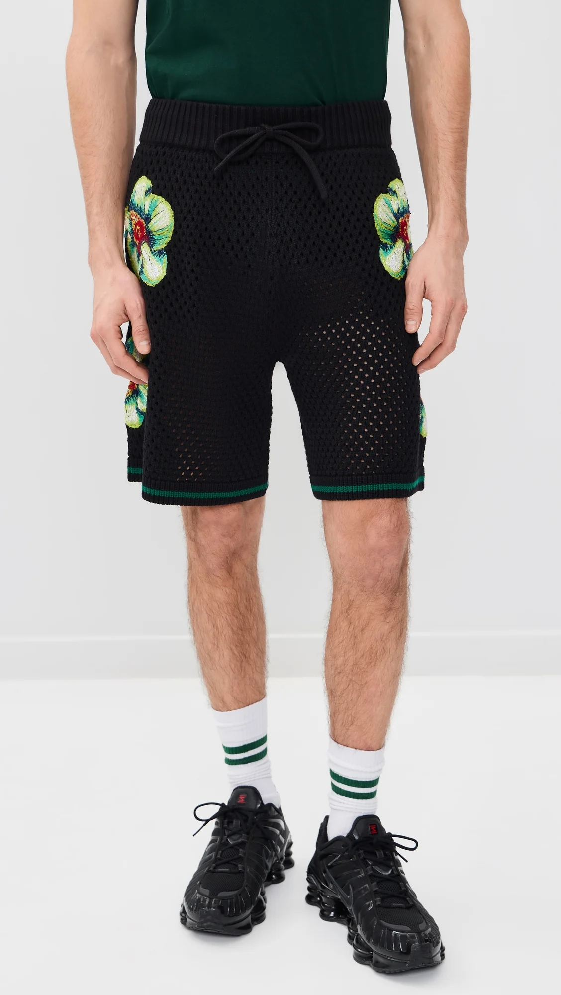 - Fabric: Mid-weight stretch crochet - Embroidered flowers - Covered elastic waist with drawstring - Shell: 100% cotton - Unlined - Hand wash - Imported, China Style #CASAC30025 Size & Fit Model measurements: Size M: Gordon (6'1") usually wears size M Measurements from size M Rise: 11.75in / 30cm Inseam: 30.75in / 78cm Outseam: 17.75in / 45cm
