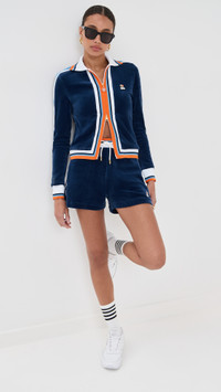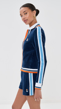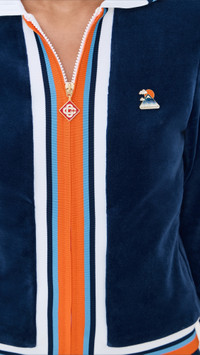 - Fabric: Mid-weight stretch velour - Striped trim - Logo plaque at breast - Collared neck - Long sleeves - Two-way zip closure - Zip side pockets - Shell: 89% cotton/11% polyamide - Mesh lining - Lining: 100% polyester - Wash cold - Made in Portugal Style #CASAB30288 Size & Fit Model measurements: Size XS: Drew (5'8") usually wears size XS-S Measurements from size S Length: 21.25in / 54.0cm, from shoulder