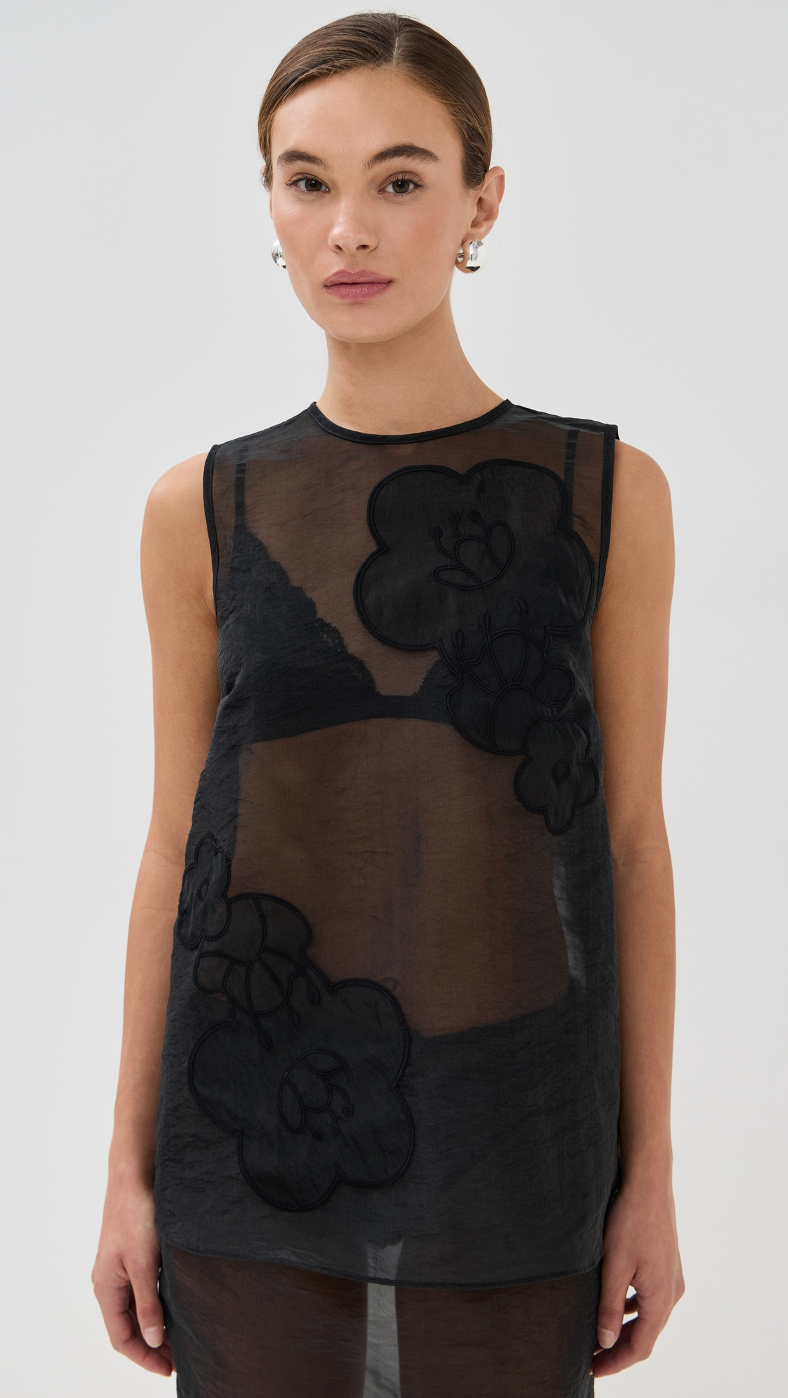 - Fabric: Lightweight, non-stretch organza - Sheer floral embroidery - Crew neck - Sleeveless - Tie keyhole at back neckline - Sheer - Shell: 55% polyamide/45% polyester - Hand wash - Imported, Latvia Style #CBAHN30128