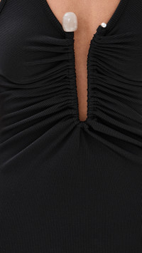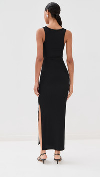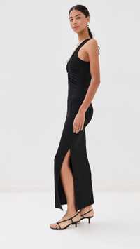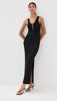 - Fabric: Mid-weight, super-stretch ribbed jersey - Structured cutout at front with quartz detail and ruching - Maxi length - Scoop neck - Sleeveless - Pullover design, no closure - Shell: 96% polyester/4% spandex - Unlined - Dry clean - Imported, Vietnam Style #CESBE30250