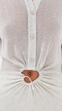 - Fabric: Lightweight, super-stretch metallic knit - Christopher Esber is part of The Climate Pledge, a commitment to reaching net-zero carbon emissions by 2040 - Cutout at front with structured silver-tone hardware - Maxi length - Collared neck - Long sleeves with button cuffs - Partial button placket - Shell: 64% viscose/20% polyamide/16% polyester - Unlined bodice, lined skirt - Lining: 64% nylon/36% elastane - Dry clean - Imported, Vietnam Style #CESBE30251 Size & Fit Model measurements: Size 4: Rocio (5'11") usually wears size 4 Measurements from size 4 Length: 62.25in / 158.0cm, from shoulder