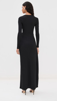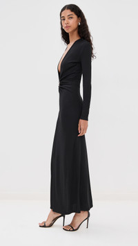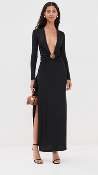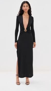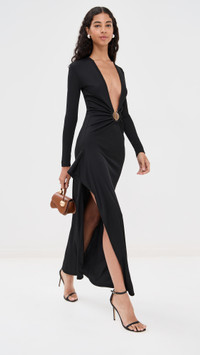 - Fabric: Mid-weight, super-stretch ribbed jersey - Ruched O-ring hardware with mineral stone accent at front - Draped detail with side slit at side - Maxi length - V neck - Long sleeves - Pullover design, no closure - Shell: 96% polyester/4% spandex - Unlined - Dry clean - Imported, Vietnam Style #CESBE30273