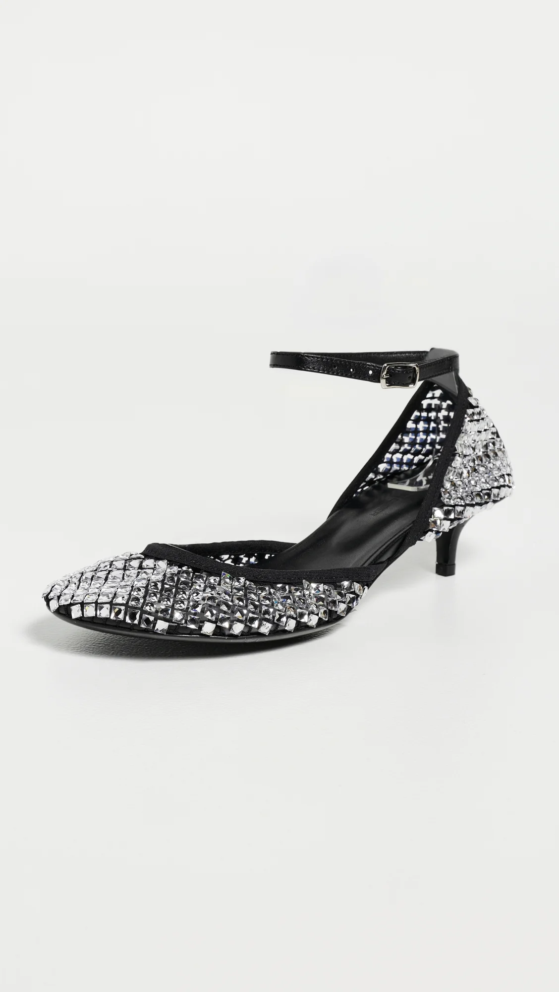 - Upper: Netting - Christopher Esber is part of The Climate Pledge, a commitment to reaching net-zero carbon emissions by 2040 - Allover glass crystal embellishments - Lining: Leather - Kitten heel - Buckle ankle strap - Round toe - Leather sole with rubber patch - Made in Italy - This item cannot be gift-boxed Style #CESBE30287 Size & Fit This shoe is available in whole sizes only. If you wear a half size, please size up. Heel: 1.5in / 40mm