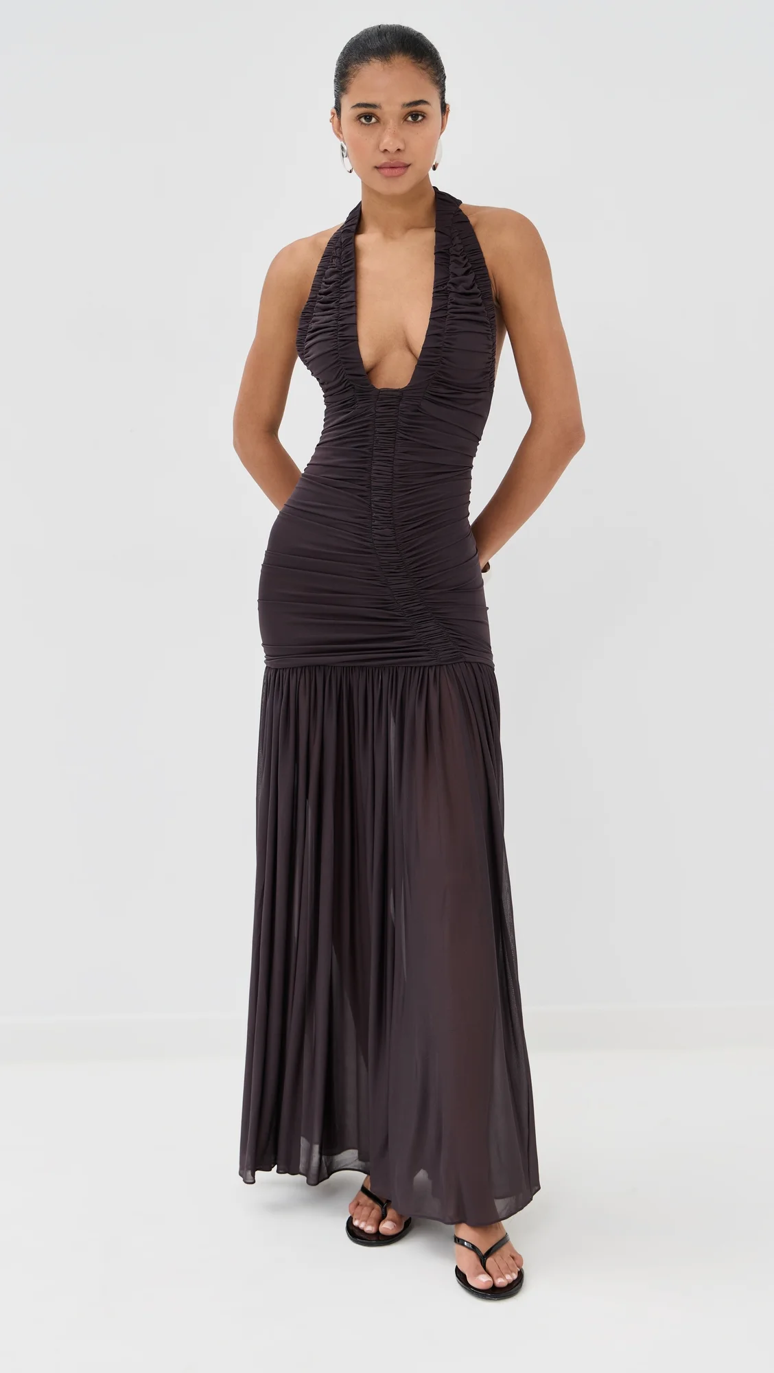 - Fabric: Lightweight slinky jersey with stretch - Ruched bodice - Maxi length - V neck - Sleeveless - Pullover design, no closure - Shell: 71% rayon/29% polyester - Lined bodice, unlined skirt - Dry clean - Imported, China Style #CESBE30274