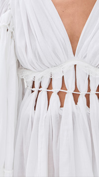 - Fabric: Mid-weight, non-stretch muslin - Christopher Esber is part of The Climate Pledge, a commitment to reaching net-zero carbon emissions by 2040 - Twisted fringe detail at waist and sleeves - Lace detail at bodice - Mini length - V neck - Long bell sleeves - Tie at neckline - Semi-sheer - Shell: 55% cotton/45% viscose - Trim: 72% polyamide/28% cotton - Unlined - Dry clean - Imported, India Style #CESBE30248 Size & Fit Customers say: Runs small; please size up. Model measurements: Size 4: Rocio (5'11") usually wears size 4 Measurements from size 4 Length: 30.75in / 78.0cm, from shoulder