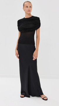 - Fabric: Lightweight slinky ribbed mesh - Sheer overlay with allover ruching - Crew neck - Short sleeves - Shell: 95% viscose/5% elastane - Trim: 100% silk - Dry clean - Imported, Vietnam Style #CESBE30202 Size & Fit Measurements from size 6 Length: 22in / 56.0cm, from shoulder