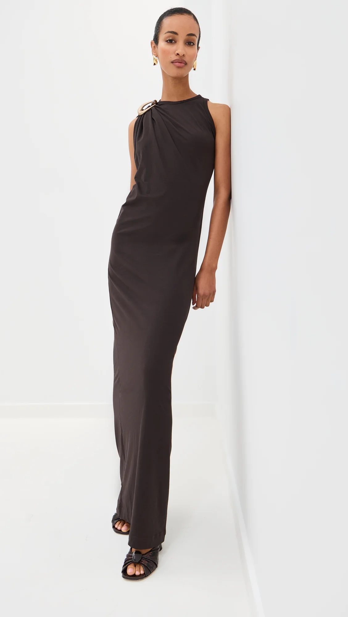 - Fabric: Lightweight stretch jersey - Brass hardware at shoulder with natural stone accent - Draped front - Maxi length - Crew neck - Sleeveless - Pullover design, no closure - Shell: 93% cotton/7% elastane - Unlined - Dry clean - Imported, Vietnam Style #CESBE30271
