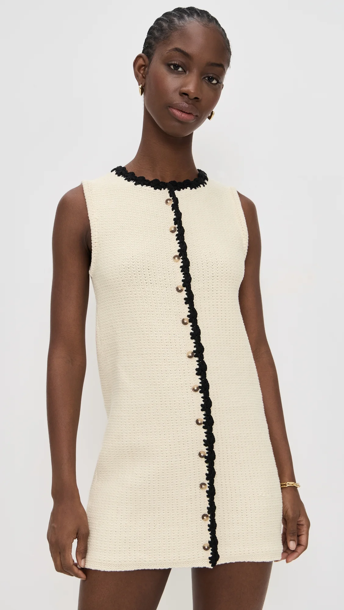 - Fabric: Mid-weight stretch knit - Contrast crocheted trim - Mini length - Crew neck - Sleeveless - Button placket - Shell: 100% cotton - Unlined - Dry clean - Imported, Peru Style #CIAOL30240