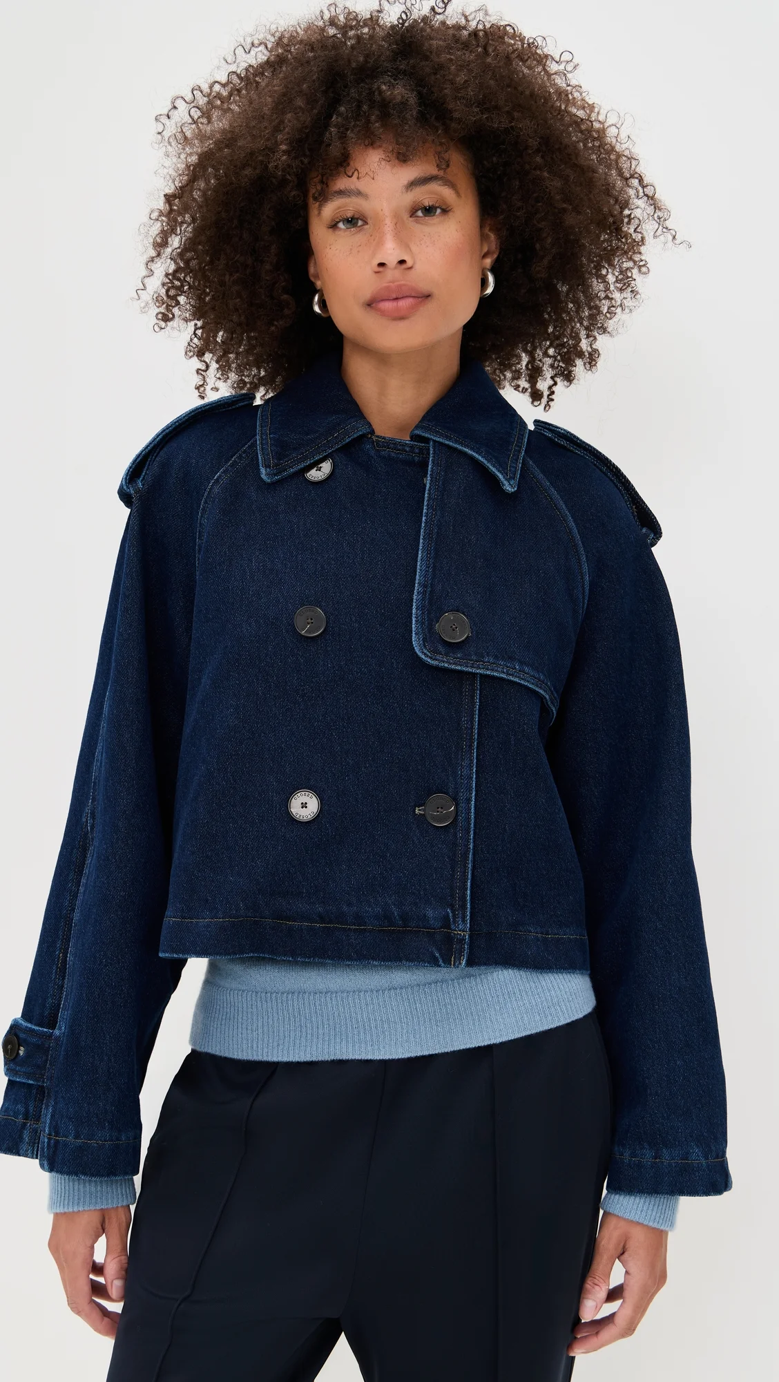 - Fabric: Heavyweight, non-stretch denim - Shoulder epaulettes - Flap detail at front - Box pleat at back - Collared neck - Long sleeves with button cuffs - Double-breasted button placket - Shell: 100% cotton - Lined - Lining: 100% viscose - Dry clean - Imported, Romania Style #CLOSD30515 Size & Fit Model measurements: Size XS: Drew (5'8") usually wears size XS-S Measurements from size XS Length: 19.75in / 50.0cm, from shoulder