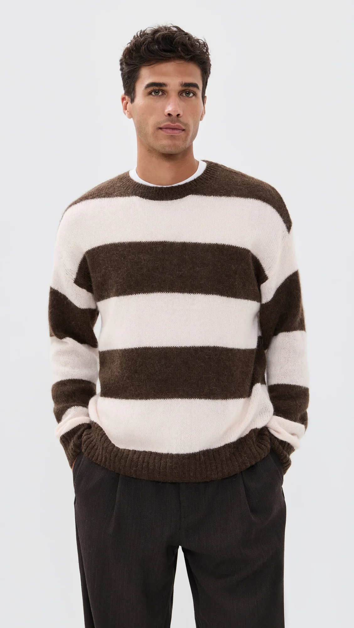 - Fabric: Mid-weight brushed knit - Stripe pattern - Ribbed edges - Crew neck - Long sleeves - Shell: 35% alpaca/35% wool/30% polyester - Hand wash - Imported, China Style #CLOSD30538 Size & Fit Model measurements: Size M: Laurence (6'2") usually wears size M Measurements from size M Length: 26in / 66cm Sleeve: 34.75in / 88cm Chest: 45in / 114cm