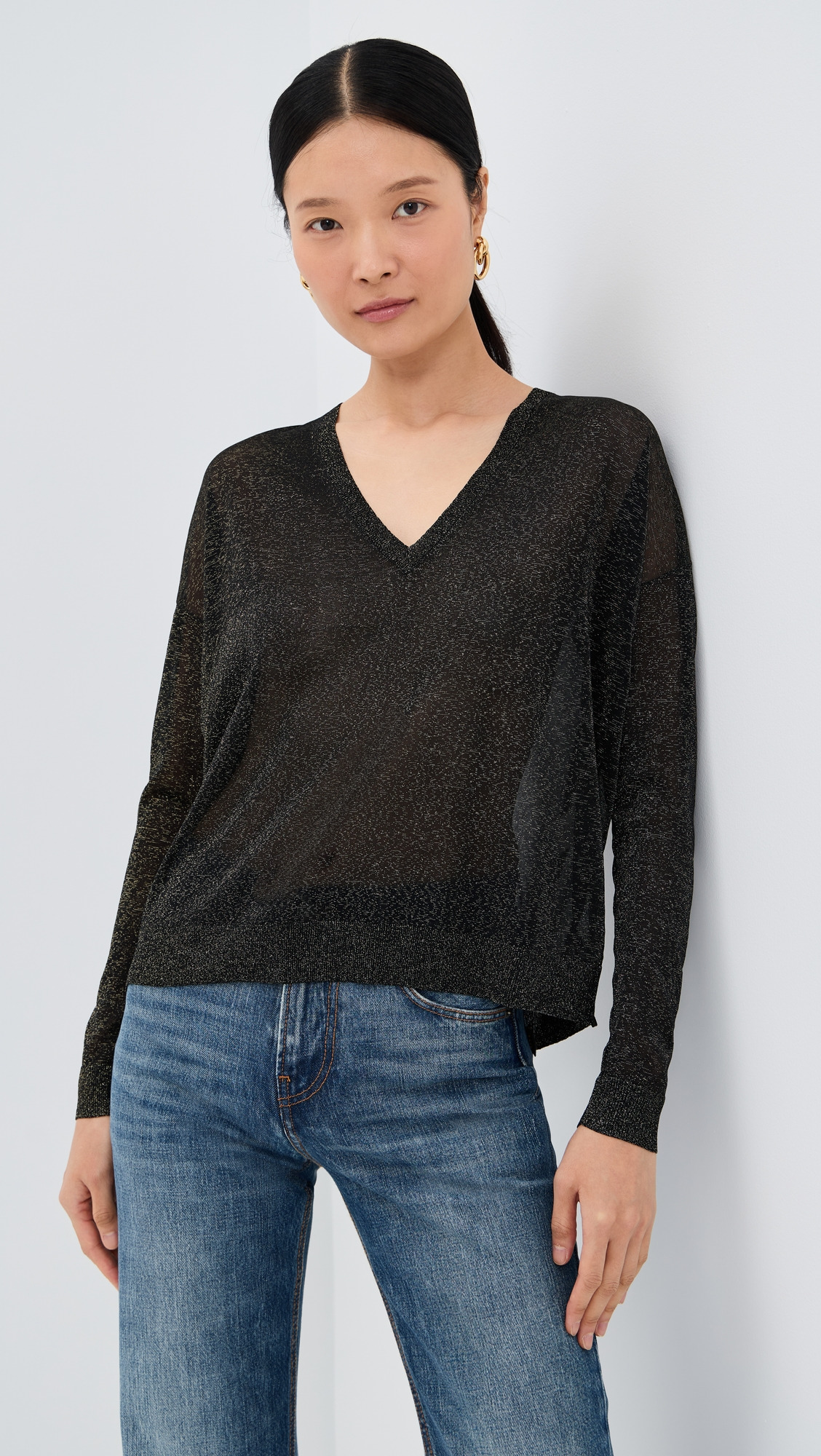 - Fabric: Lightweight, super-stretch metallic knit - Ribbed trim - V neck - Long sleeves - Semi-sheer - Shell: 80% ramie/20% metallic - Dry clean - Imported, China Style #COCLT30131 Size & Fit Model measurements: Size XS: Somin (5'10.5") usually wears size XS-S Measurements from size S Length: 21.75in / 55.0cm, from shoulder