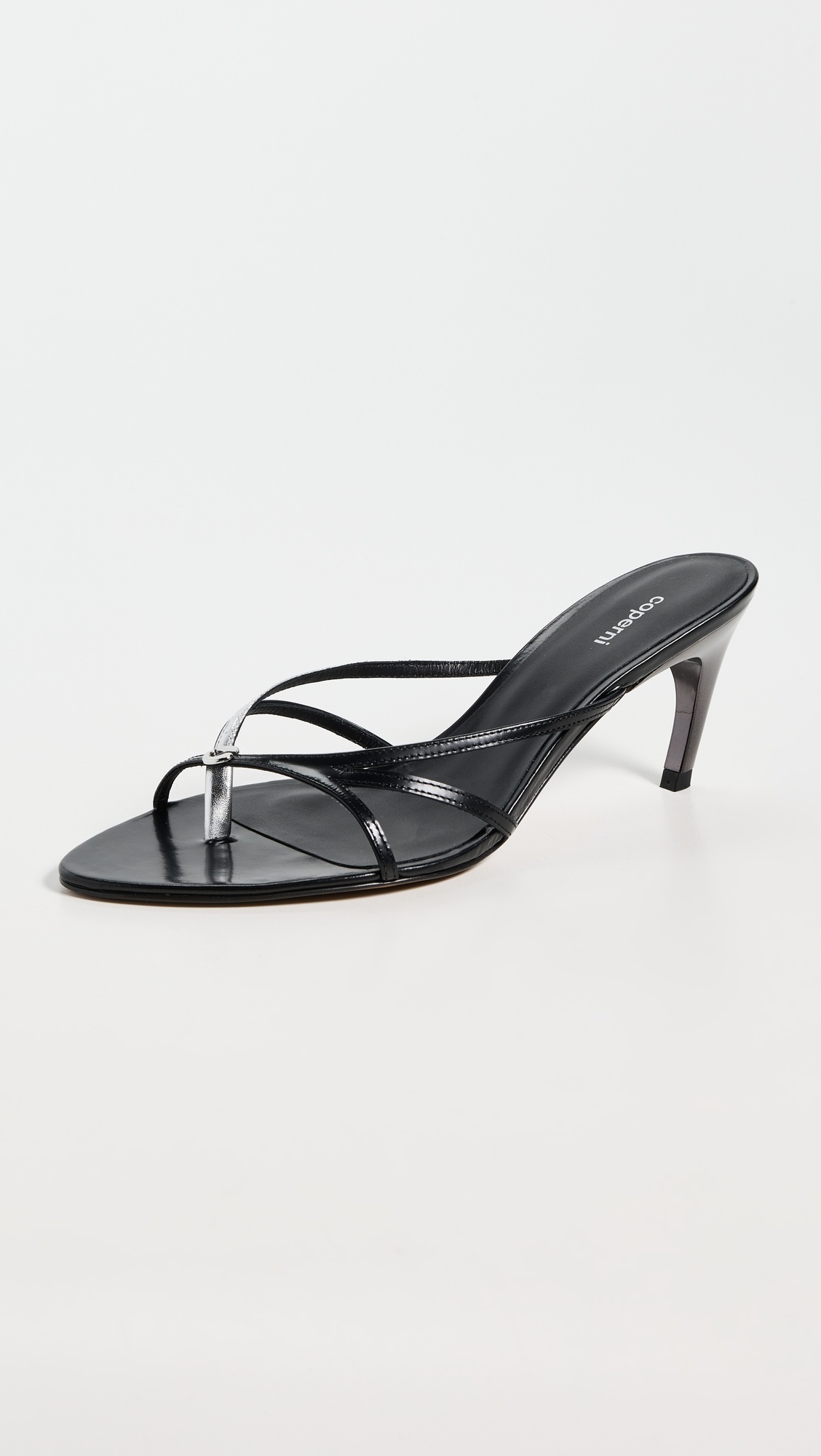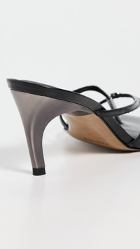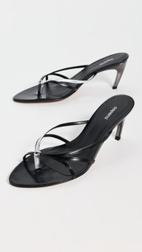 - Upper: Leather - Silver-tone logo emblem at top - Metallic accent strap - Lining: Leather - Statement heel - Slip on - Open toe - Leather sole with rubber heel cap - Made in Spain - This item cannot be gift-boxed Style #COPEA30158