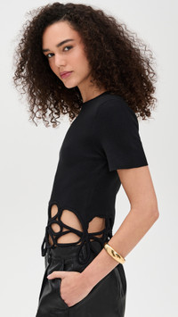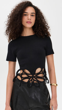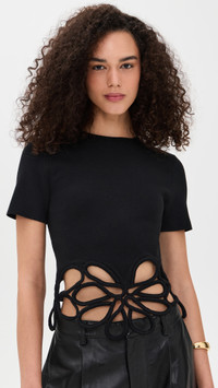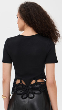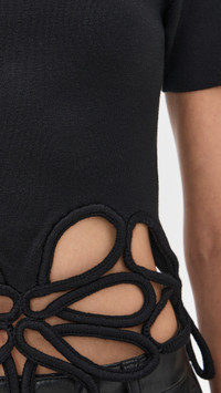 - Fabric: Mid-weight compact knit with stretch - Corded crochet cutouts at hem - Ribbed crew neck - Short sleeves - Shell: 79% viscose/21% nylon - Dry clean - Imported, China Style #CULTG31468