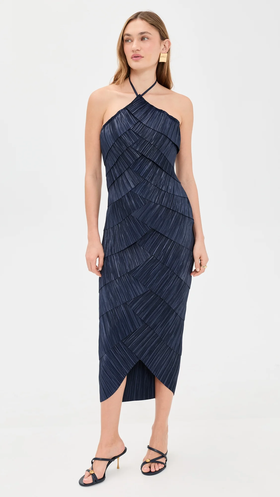 - Fabric: Lightweight, low-stretch plisse weave - Metallic finish - Interior boned bodice with elastic band - Halter tie straps - Midi length - Halter neckline - Sleeveless - Hook-and-eye and hidden zip at side - Shell: 100% polyester - Mesh lining - Lining: 100% polyester - Dry clean - Imported, China Style #CULTG31541 Size & Fit Model measurements: Size 2: Alissa (5'8.5") usually wears size 2 Measurements from size 0 Length: 43.25in / 110.0cm, from center back