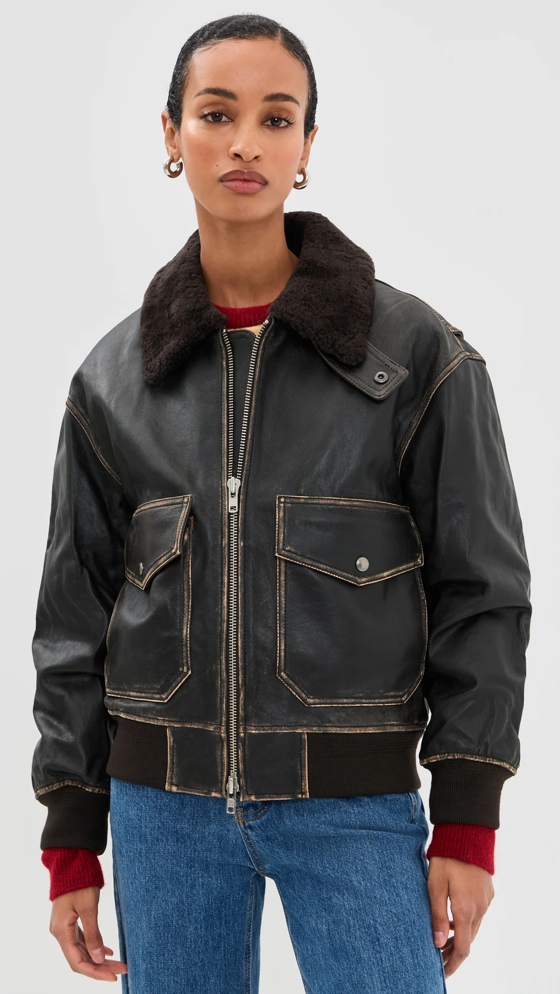 - Fabric: Heavyweight, non-stretch lambskin - Shearling collar - Snap chin strap - Ribbed elastic trim - Collared neck - Long sleeves with elastic cuffs - Two-way zip closure - Multiple exterior and interior pockets - Shell: 100% leather - Lined - Lining: 100% polyester - Dry clean - Imported, China Style #DUNST30000