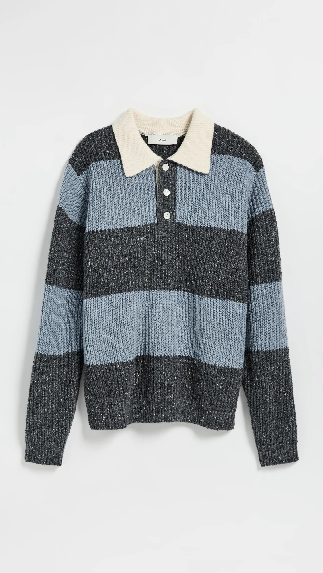 - Fabric: Mid-weight ribbed knit with stretch - Stripe pattern - Contrast collar - Polo neckline - Long sleeves - Partial button placket - Shell: 48% wool/30% nylon/22% acrylic - Dry clean - Imported, Vietnam Style #DUNST30005