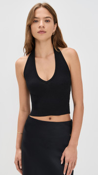 - Fabric: Lightweight, super-stretch ribbed jersey - Halter neckline - Sleeveless - Shell: 48% cotton/48% modal/4% spandex - Wash cold - Made in the USA Style #ETRNE30052 Size & Fit Model measurements: - Size XS: Margaret (5'11") usually wears size XS - Size XS: Cai (5'7") usually wears size XS Measurements from size S Length: 15in / 38.0cm, from shoulder