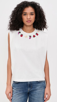 - Fabric: Lightweight, low-stretch jersey - Beaded fruit details - Crew neck - Sleeveless - Shell: 100% cotton - Wash cold - Imported, India Style #FARMR31323 Size & Fit Model measurements: Size XS: Eyshila (5'10") usually wears size XS Measurements from size XS Length: 21.75in / 55.0cm, from shoulder