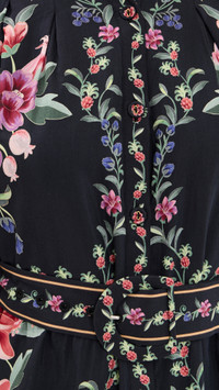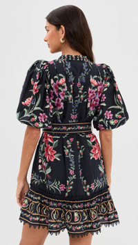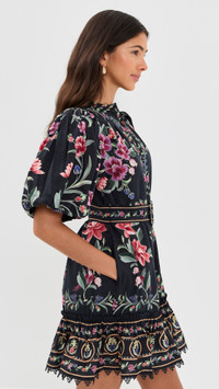- Fabric: Lightweight. non-stretch weave - Floral pattern - Pleated design - Ruffle and lace details at hem - Mini length - Crew neck - Short puff sleeves with elastic cuffs - Button placket and self-belt at waist - On-seam side pockets - Shell: 60% cotton/40% viscose - Lined - Lining: 100% viscose - Wash cold - Imported, Turkey Style #FARMR31222