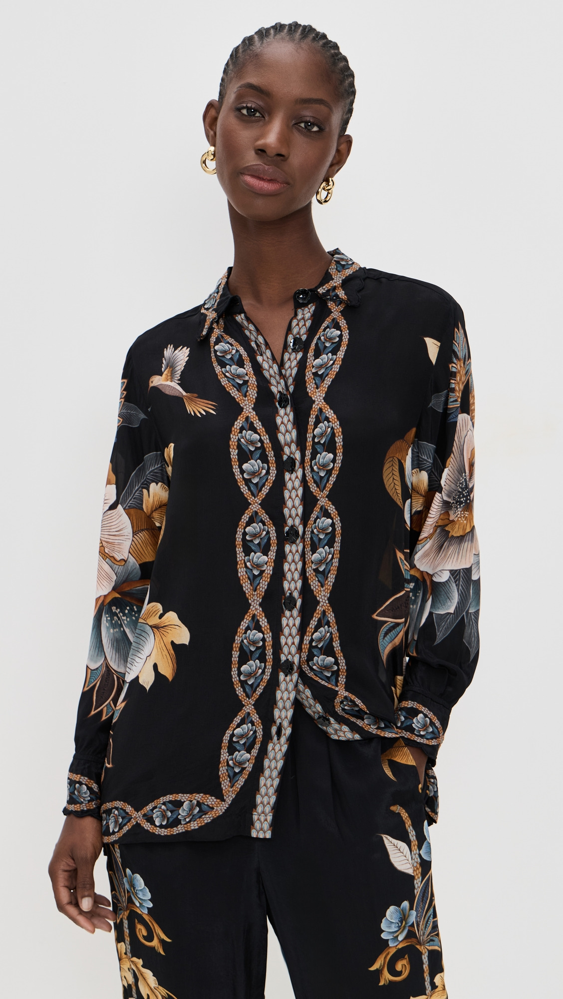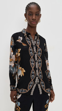 - Fabric: Lightweight, non-stretch silky weave - Tropical print - Collared neck - Long sleeves with button cuffs - Button placket - Shell: 100% viscose - Wash cold - Imported, India Style #FARMR31246 Size & Fit Model measurements: Size XS: Cher (5'11") usually wears size XS Measurements from size XS Length: 27.5in / 70.0cm, from shoulder