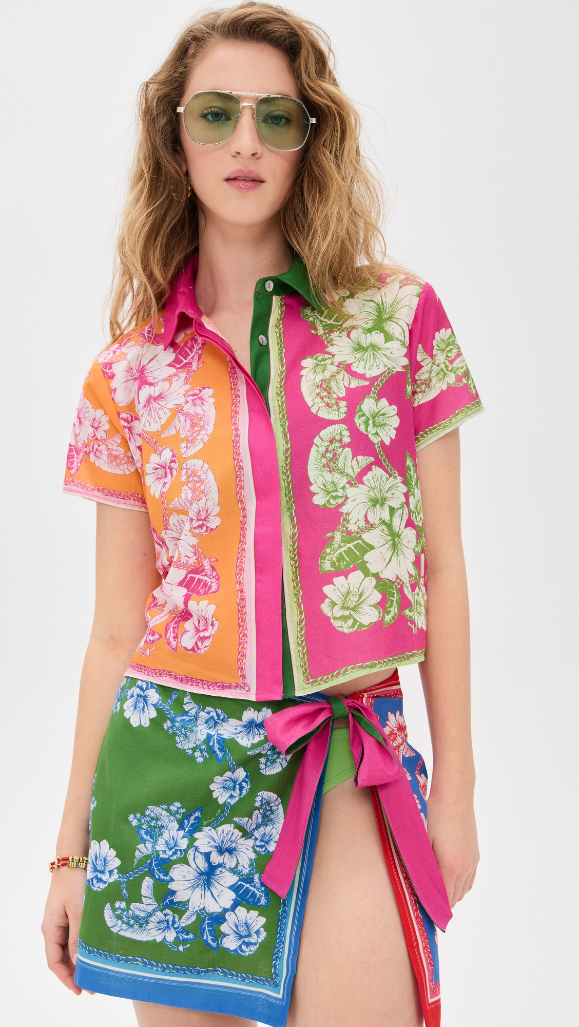 - Fabric: Lightweight, non-stretch weave - Floral print and colorblock design - Collared neck - Covered button placket - Shell: 100% cotton - Wash cold - Imported, India - Short sleeves Style #FARMR31072