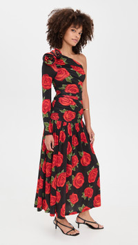- Fabric: Lightweight, super-stretch fine jersey - Rose print and 3D rose accents at shoulder - Dropped asymmetrical waist - Ruched bodice with gathered skirt - Midi length - One-shoulder neckline - Long sleeves - Hook-and-eye and hidden zip at side - Shell: 85% viscose/15% elastane - Lined bodice, unlined skirt - Lining: 100% viscose - Hand wash - Imported, Turkey Style #FARMR31229 Size & Fit Model measurements: Size XS: Alexis (5'8") usually wears size XS-S Measurements from size XS Length: 55in / 140.0cm, from shoulder to front hem