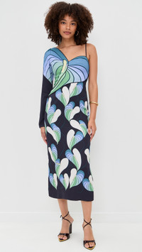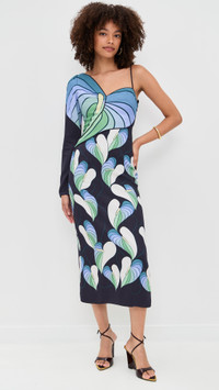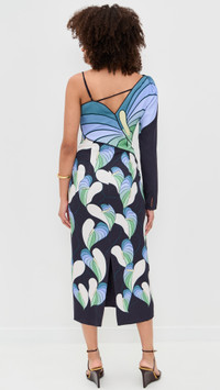 - Fabric: Lightweight, non-stretch twill - Floral print - Slit at back - Midi length - One-shoulder neckline - Long sleeves - Hook-and-eye and hidden zip at side - Shell: 100% rayon - Lined - Lining: 100% viscose - Wash cold - Imported, China Style #FARMR31297