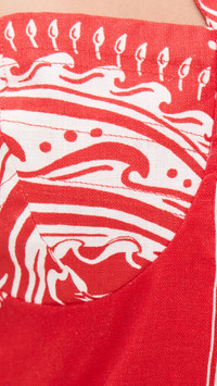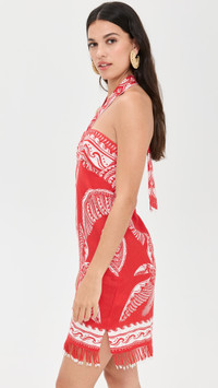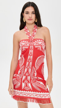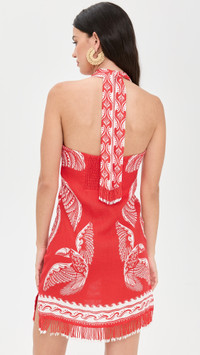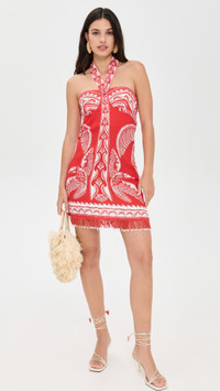 - Fabric: Lightweight, non-stretch linen weave - Beaded fringe at hem - Smocked elastic at back - Nonslip rubber binding at top hem - Mini length - Halter neckline - Sleeveless - Hook-and-eye and hidden zip at side - Shell: 100% linen - Unlined - Hand wash - Imported, China Style #FARMR31161