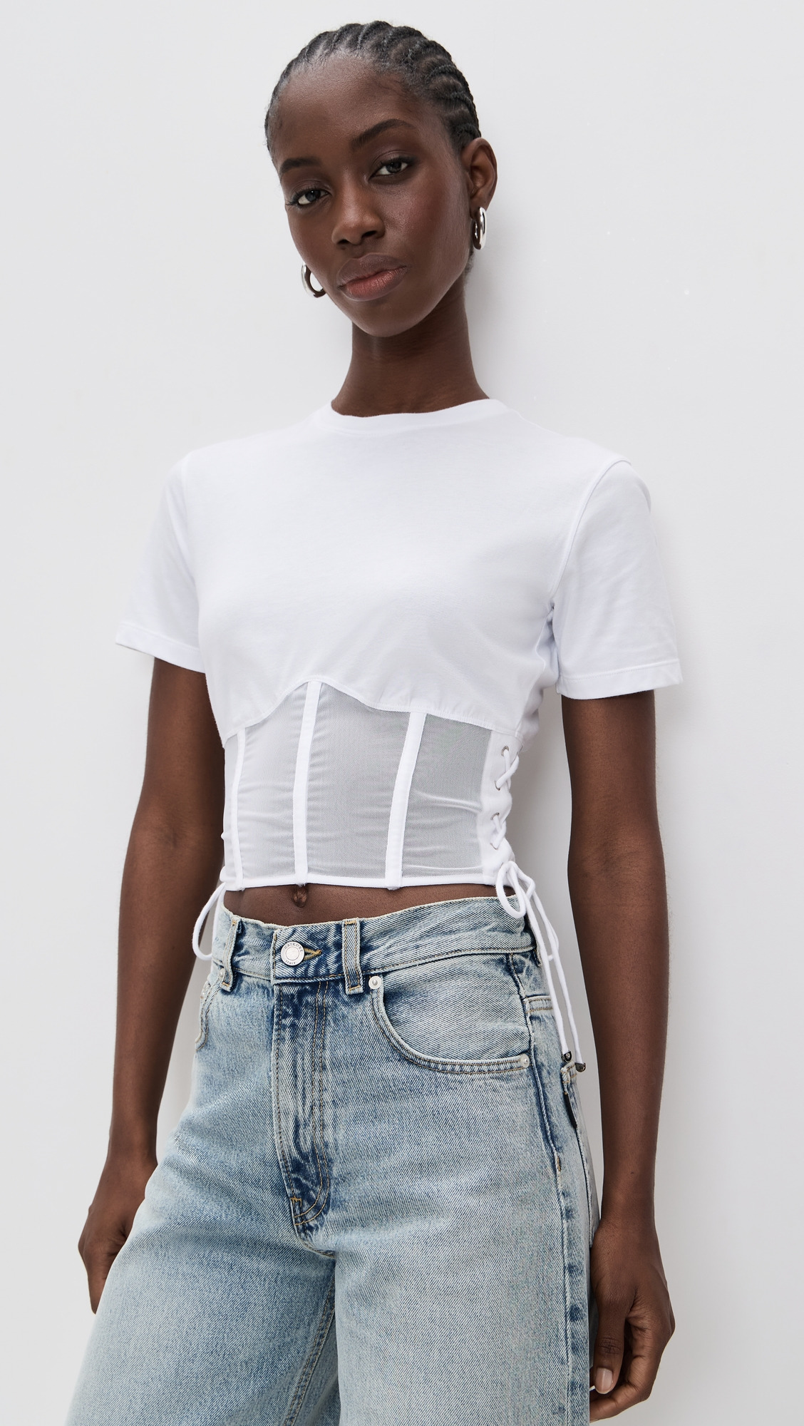 - Fabric: Lightweight, low-stretch jersey - Mesh corset waist with boned seams and side ties - Crew neck - Short sleeves - Hidden zip at back - Shell: 100% cotton - Trim: 78% polyamide/22% spandex - Dry clean - Imported, China Style #FDUMA31012