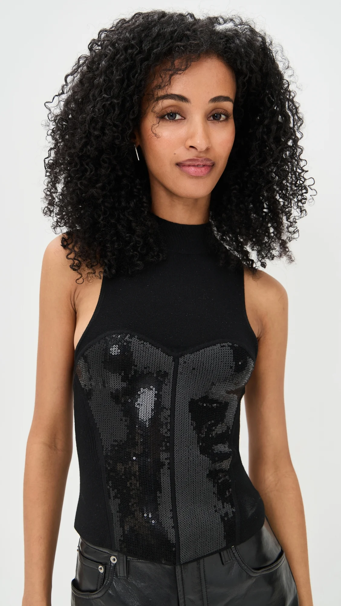 - Fabric: Lightweight stretch knit - Sequined embellished bustier-inspired panel at front - Ribbed edges - Mock neck - Sleeveless - Shell: 72% viscose/28% polyester - Dry clean - Imported, China Style #FDUMA31070