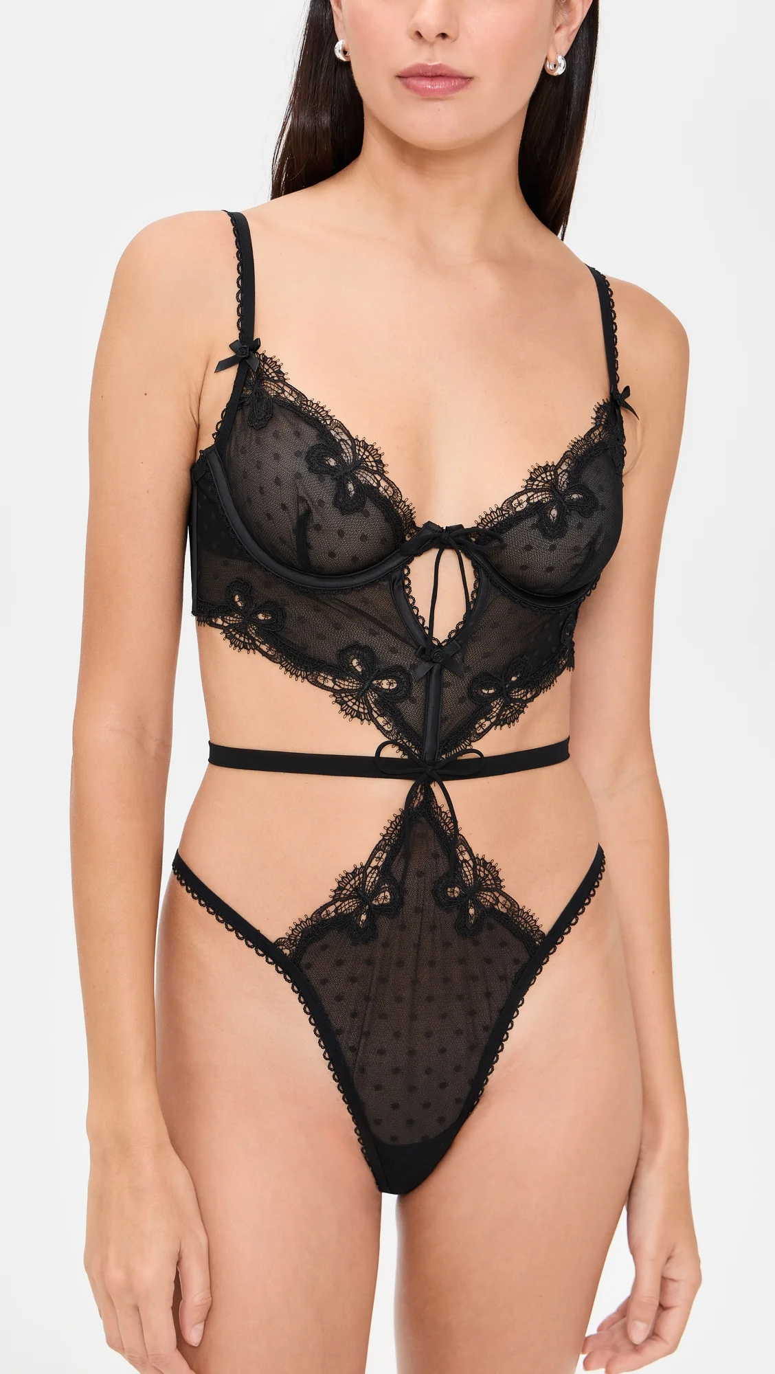 - Fabric: Lightweight, non-stretch tulle - Swiss dot pattern - Lace trim - Adjustable shoulder straps - Thong back and closed gusset - Tie at waist - Adjustable hook-and-eye closures - Sheer - Shell: 100% polyester - Hand wash - Imported, China Style #FLOVE31398