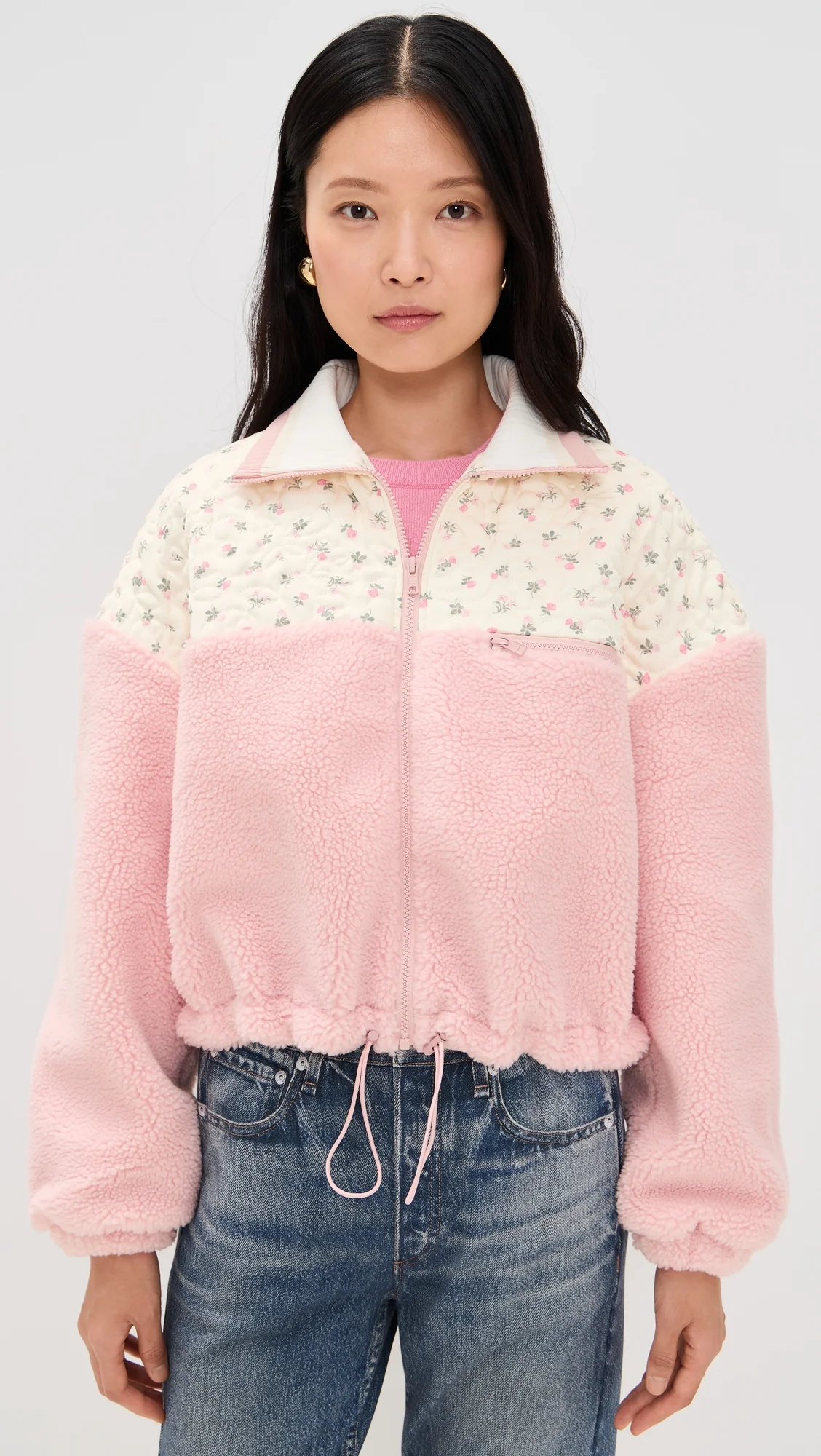 - Fabric: Mid-weight, non-stretch sherpa - Satin floral print paneling - Ribbed trim - Drawcord with toggle hem - Collared neck - Long sleeves with elastic cuffs - Zip at front - On-seam side pockets - Zip breast pocket - Shell: 73% polyester/27% acetate - Trim: 98% polyester/2% elastane - Lined - Lining: 100% polyester - Wash cold - Imported, China Style #FLOVE31390