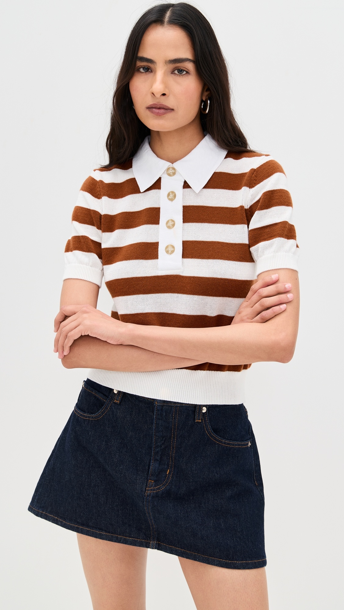- Fabric: Lightweight stretch knit - Stripe pattern - Polo neckline - Short sleeves - Partial button placket - Shell: 63% cashmere/37% cotton - Dry clean - Imported, China Style #FRAME32938