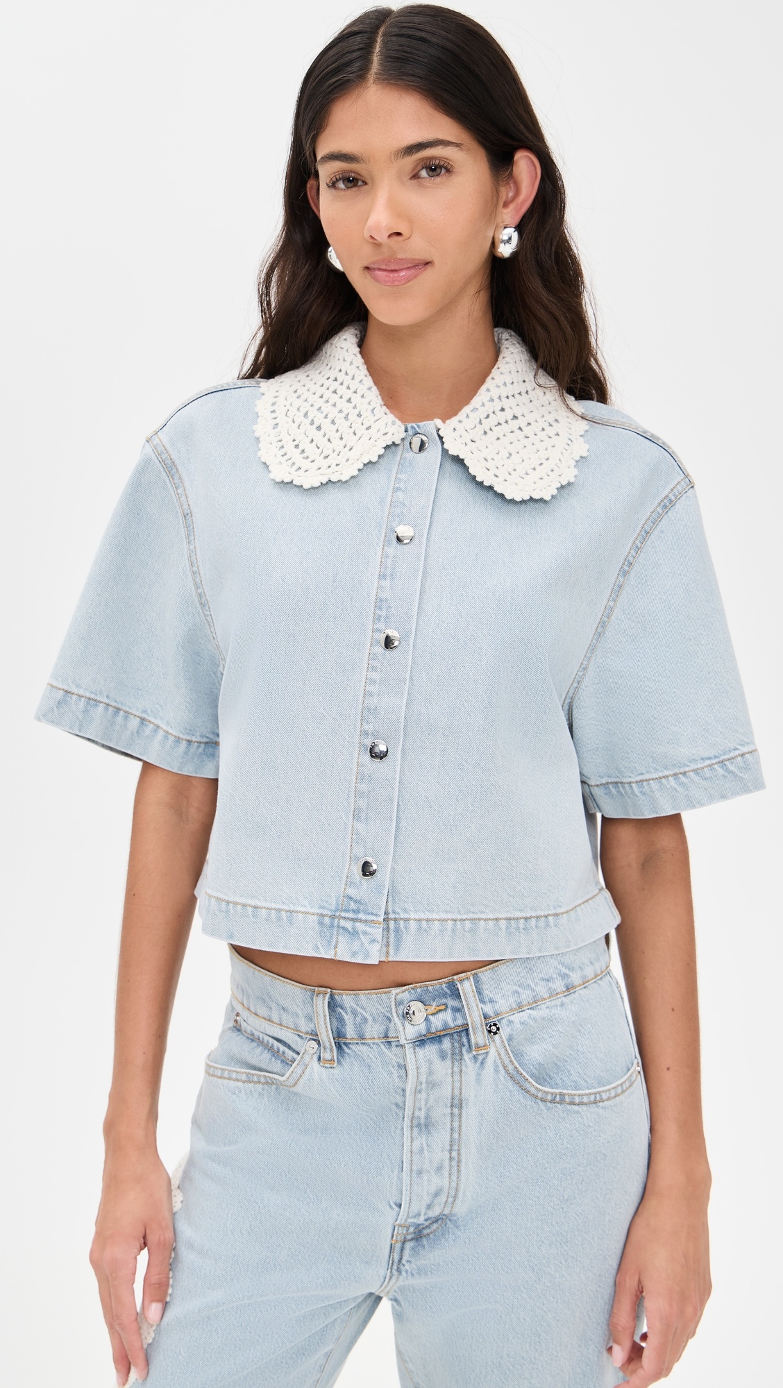 - Fabric: Lightweight, non-stretch denim - Crochet trim - Collared neck - Short sleeves - Snap placket - Shell: 75% cotton/25% lyocell - Dry clean - Imported, China Style #FRAME33079