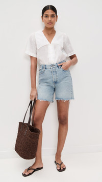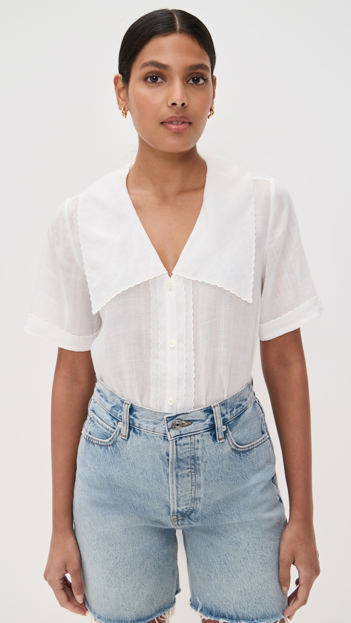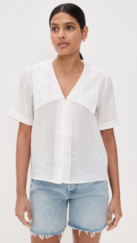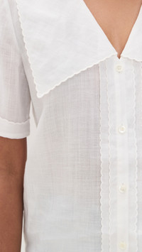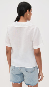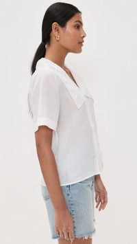 - Fabric: Lightweight, non-stretch crisp weave - Scalloped edges - V neck - Short sleeves - Button placket - Shell: 100% ramie - Hand wash - Imported, China Style #FRAME32918