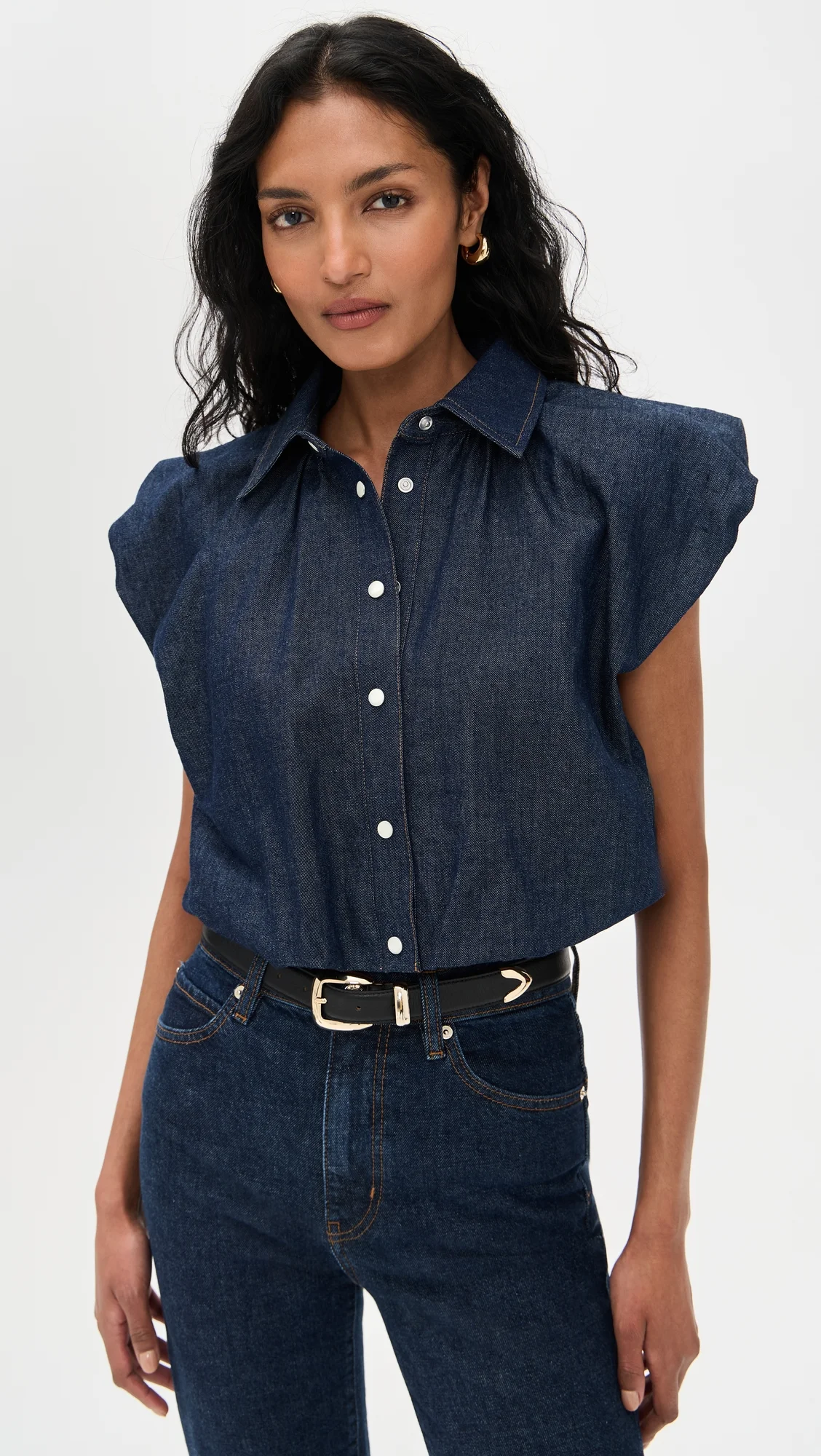 - Fabric: Lightweight, non-stretch denim - Bubble sleeves and hem - Contrast stitching - Collared neck - Short cap sleeves - Snap placket - Shell: 100% cotton - Lined - Wash cold - Imported, Turkey Style #FRAME33088 Size & Fit Model measurements: Size XS: Shaanti (5'8") usually wears size XS Measurements from size XS Length: 17in / 43.0cm, from shoulder